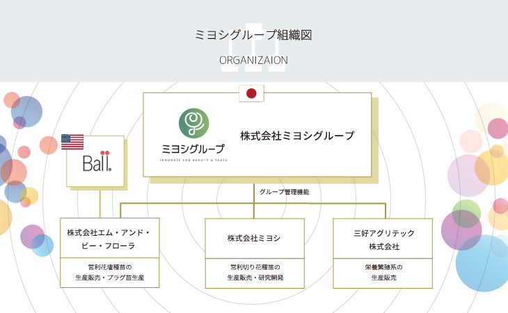 1949 Tsuneo Miyoshi establishes Miyoshi Shokai in Shibuya Ward 1950 Reorganized as Miyoshi Shokai Limited Company 1963 Constructed and relocated headquarters to Hyakunincho, Shinjuku Ward 1969 Announced Mericlone seedlings for carnations and chrysanthemums 1970 Established MC Research Institute in Hachimanyama, Setagaya Ward,Commences commercialization of tissue culture 1973 Opens and commences operations at Yatsugatake Farm and MC Research Institute (now R&D Center) in Kobuchizawa Town, Hokuto City, Yamanashi Prefecture 1974 Releases mericlone seedlings of gypsophila 1976 Releases carnation"Angel" 1978 Reorganized as Miyoshi Co., Ltd. 1980 Announced mericlone seedlings of Limonium altica 1982 Established Fukuoka Sales Office in Fukuoka City, Fukuoka Prefecture 1984 Announced aster "Koma Series" 1985 Announced plug seedlings for cut flowers 1986 Relocated headquarters to Hachimanyama, Setagaya Ward;Merged with MC Production Setagaya Branch 1987 Utsuo Miyoshi appointed Chairman; Seiki Miyoshi appointed Representative Director 1988 Established joint venture GBC (Ginwa Biological Science Co., Ltd.) in Taiwan Invested in TM Ball Research Institute Co., Ltd. Opened new farm in Kobuchizawa Town, Hokuto City, Yamanashi Prefecture (present Carnation Factory) 1989 Established Sahoro Farm in Hokkaido as a cold-climate test farm Announced potted carnation "Baby Heart" 1990 Established Sapporo Sales Office in Sapporo, Hokkaido 1991 Announced arrangement aster "Hime Series" 1992 Announced carnation "Ayako" 1993 Established new farm(current Plant Factory). Simultaneously opened the Yatsugatake Sales and Seedling Center, consolidating the Sales and Production Departments from the Setagaya headquarters to integrate development, production, and sales. 1997 Merged to establish 1998 Perennial plant farm established adjacent to Yatsugatake Sales Nursery Center 1999 50th Anniversary 2000 Seed storage and shipping facilityand shipping facility and new office within the Yatsugatake Sales Nursery Center 2001 Opened Oizumi Farm in Oizumi Town as a strawberry production facility 2005 Established Miyoshi Agri Tech Co., Ltd., a company for the production and sales of vegetable seedlings 2007 Transferred carnation division to Miyoshi Agri Tech Co., Ltd. Masakazu Miyoshi appointed Chairman of Miyoshi, Masakazu Miyoshi appointed Representative Director 2009 60th Anniversary 2012 Miyoshi Wholesale Division and TM Ball merged into M&B Flora Merged into M&B Flora, a production and sales company for potted plants, bedding plants,Production and sales company for home centers 2013 Integrated administrative departments of each company into Miyoshi and changed trade name to Miyoshi Group Simultaneously established Miyoshi Co., Ltd. as a company for the production, sales, and R&D of commercial cut flower seedlings